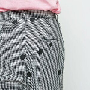 Details: Houndstooth and polka dot print, cuffed hems, cropped length