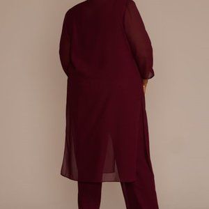 Le Bos Three Piece Tiered Chiffon Pantsuit Size 16W NWT. From David’s Bridal. Beautiful pantsuit, light and airy. Burgundy in colour. Style 27854. Smoke free home. Please feel free to ask questions. Happy poshing!