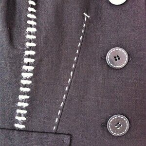 This linen blend stylish black blazer from Le Chateau features a tailored fit with short sleeves, making it ideal for warmer weather. The notched lapel collar adds a classic touch, while the decorative white stitching enhances its shape and visual appeal. Ideal fr wearing with skirts, pants, white jeans or over the dress.