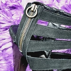 Strappy black Sandals with a thick heel measuring 4" tall. Very comfortable due to the thickness of the heel. Sandals zip up on the outside with a brass toned zipper with a loop for easy zipping & unzipping.