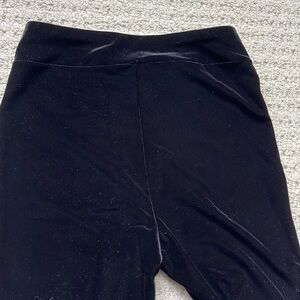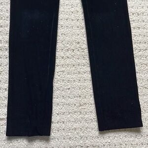 These black velvety leggings are in pristine like new condition with no holes or stains. Higher waist, skinny legs. Great with boots! Made in Canada 🇨🇦! Tagged a size 0, laying flag they measure: