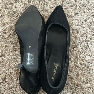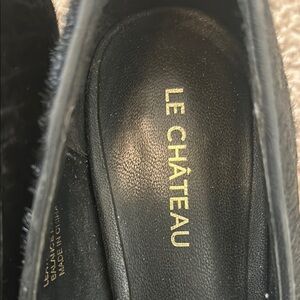 Experience timeless elegance with Le Chateau's black slip-on pump, featuring a minimalist design with feather like texture. They are perfect for both casual and business casual settings. The classic pump and matte finish add a touch of sophistication to any outfit. EUC.