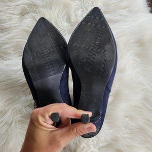 Le Chateau Stiletto Heel Boots Booties Buckle Strap Chains Pointed Toe Zippered Navy Blue Size 7