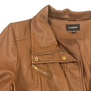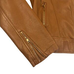 This stylish brown leather motorcycle jacket features a classic biker design with a spread collar and a fitted silhouette. The rich caramel color adds warmth and sophistication, making it a versatile addition to any wardrobe.
