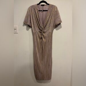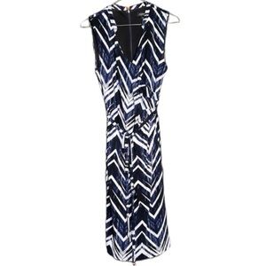 This Le Chateau wrap dress features a navy and white chevron pattern. The sleeveless dress has a surplice V-neckline and a self-tie waist belt. The knee-length hemline makes it versatile for work or evenings out.
