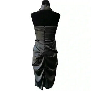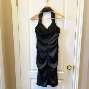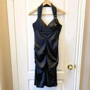 Le Chateau Cocktail Evening Dress Black Satin Halter Neck Bodycon Ruched Small