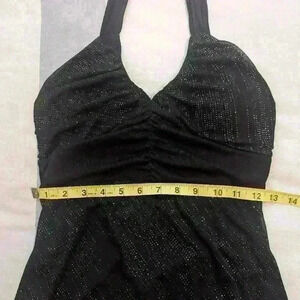 Le Chateau Formal Black Sparkly Halter Dress with light cups and a sash design under the bust in size Small. The dress is black with just the right above of sparkle, it shines as you move. Elegant design with black fabric at the halter neck which allows you to tie is to your comfort level. Worn once in excellent condition, for context I'm 5'4 about 125 pounds and it fit perfectly.