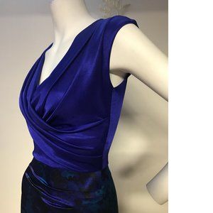 MADE IN CANADA ORIGINAL LeChateau hard to find old stock. Gorgeous and flattering. cobalt ink blue/ purple. jade teal green floral faux wrap, side drape, shiny satin summer dress. Fully lined for a sleek fit.