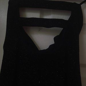 Black bodycon strapless dress. Very elegant. Back drop down to the waist with two straps across the shoulders. Inserts of semitransparent black silk form knee down to allow for free stepping and dancing. Bought in Paris, wore once for an event. Looks like new, i have the label but it is not attached.