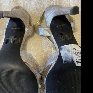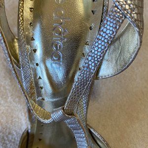 Le chateau gold-coloured shoes with 4 inch heel. The last photo shows a small scuff mark on outer right shoe. Heels in excellent condition, some marks on inner shoe in toe area (see photo).  Made with man made materials. Do not have original box.