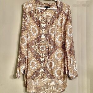Soft, drapey material. Button down. Tie at neck. Muted, autumnal colours. Seventies style retro pattern. Bottom side slits. Sleeves can be worn down (full length) or buttoned up (for a slightly shorter, slouchier look). Would look great paired with high waisted jeans or trousers.