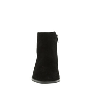 Boots are a black suede (leather upper), ankle height, pointed toe and side zipper. Heel is around .5 inches. If you have any further questions, please leave a comment below!