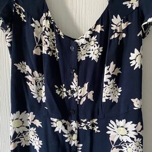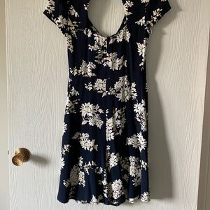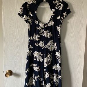 Le Chateau navy dress with white floral pattern, button-up front, cap sleeves, key-hole back. Approximate measurements: pit to pit-16 inches, waist-14 inches and length shoulder to hem-35.5 inches. Perfect dress for summer. Never worn.