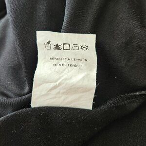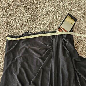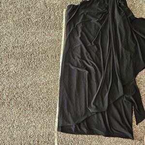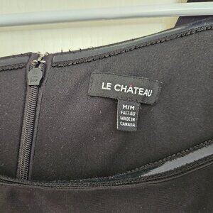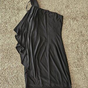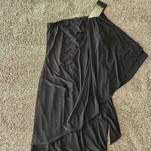 One-shoulder little black dress with metal plate on the shoulder, grip strip to help keep things in place, flowy portion off the shoulder strap in both the front and back. Back zipper closure with hook and eye at the top. Made in Canada