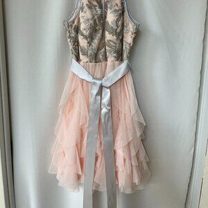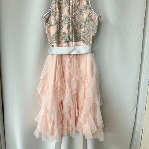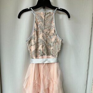 Le Chateau Prom Dress. Light pink with silver designs on the upper part of dress and a silver bow. Size Small Women's. Brand new, worn once. Halter top neckline and about mid thigh length.
