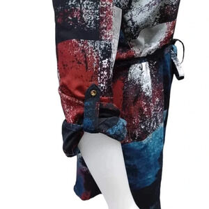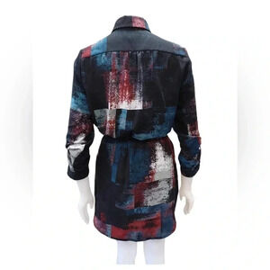 Multi colored in dark shades of plum, burgundy and Teal, this long sleeve shirt/ dress, buttons up and includes a matching sash. The cuffs can be rolled and buttoned and the collar is spread. Both sides of the garmet have side slits.