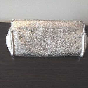 Le Chateau Silver Clutch, 10 x 5in. Pink satin inside with pocket, also over the shoulder.