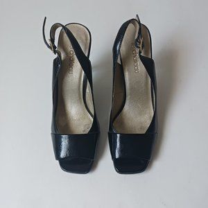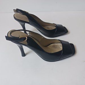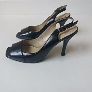 These are very stylish black slingback stilello sandals from Le Chateau. Women's size 7. They have barely been worn so they are still in excellent condition. There is almost no wear to the bottom of the heel. There is very little wear to the bottom of the shoes. The sandals are 100% synthetic material and have a bit of shine to them. The slingback straps are adjustable. The heel is approximately 3 inches.