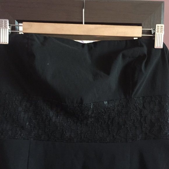 Back zippered strapless mini dress has lace detail just under the bodice. It is fully lined, with an uneven lace hem.