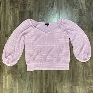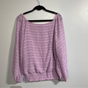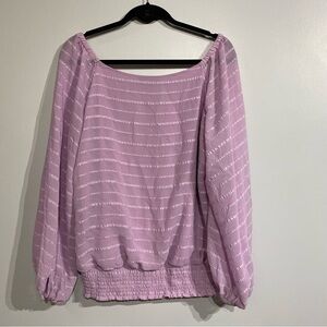 Stunning lilac v neck chiffon blouse smocked waist puff sleeve textured stripes lined
