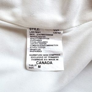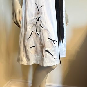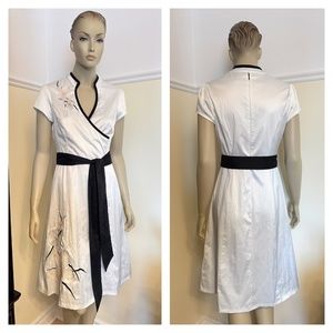 This Asian inspired ivory/black fitted dress features embroidered flowers, cap sleeves and back zip closure. Made in Canada of 55% polyester, 42% cotton and 3% spandex. Labelled size medium. Shoulders 14 inches. Bust 36 inches. Waist 28 inches. Hips 36 inches. Back length 41 inches. Sleeves 5 inches. Good pre-owned condition but has a faint stain on the front and slight discoloration under the belt (last photos).