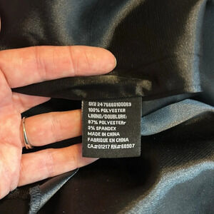 This classic black crepe cocktail dress features 4” waist panel and silver tone chain to highlight the waistline and create an hourglass silhouette. Pleats hide front pockets. Yes! a dress with pockets! 5.5” kick pleat, fully lined and trimmed with black satin piping, invisible zipper, hook and eye closure.