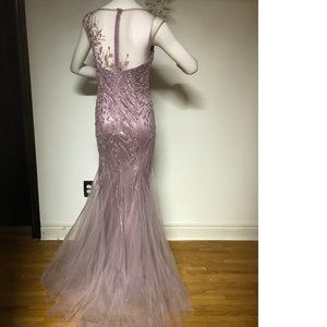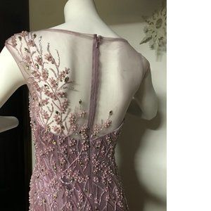 ORIGINAL LeChateau, hard to find old stock. Stunning dusty lilac / purple / lavender classic bridal/ bridesmaid / mother of the bride floor length sheer mesh embroidered with beads, sequins, pearls, wedding / prom / graduation dress, small back train, padded cups. Allover beading brings a statement-making feel to this romantic evening gown. Designed with an illusion neckline this fitted style lends a chic and glamorous look.