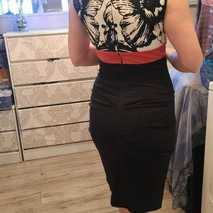 Exceptionally flattering size M bodycon cocktail, party, or office dress with flattering ruched skirt. Hits just above knee, and is less bodycon if you have less booty than the model in the pics!