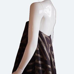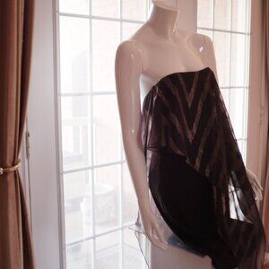 Le Chateau strapless dress asymmetric Draped with gold chevron pattern