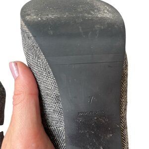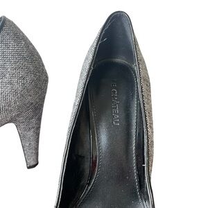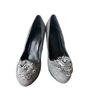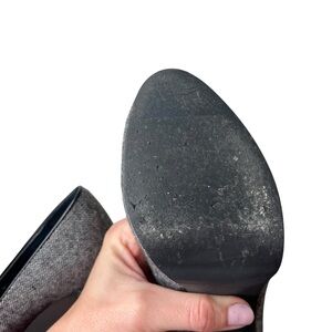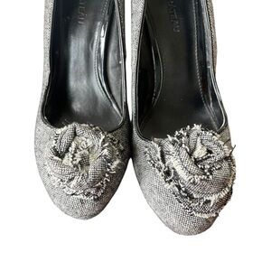 Stylish Le Château tweed heels featuring a textured gray and black bouclé-style fabric with statement flower accents on the toe. These platform pumps add height and elegance with a 4.5” heel and hidden platform for added comfort. Chic and versatile for dressy occasions, office wear, or formal events. Gently worn with some wear on soles (see photos), uppers in excellent condition.