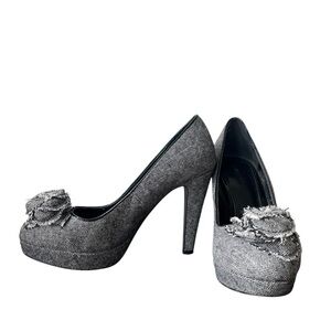 Le Chateau tweed platform heels gray black bouclé flower accent high heel 4”