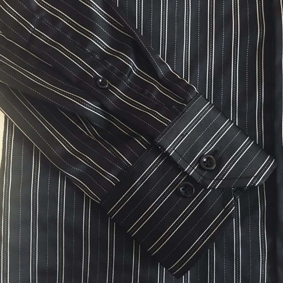 This shirt is a blend of rich polyester fibres and spandex and is washable and easy to clean and maintain. No ironing needed. Wrinkle-resistant fabric. Can be tailored and fitted. This garment was never worn and is brand new. No tags included. Garment label (content and care) attached.