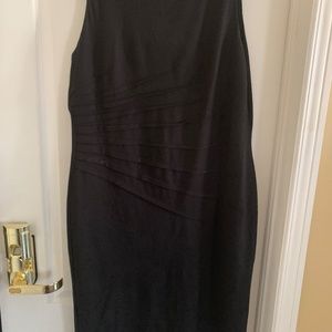 A chic and flattering sheath dress from Le Château, designed in the classic “sunburst” style reminiscent of Ivanka Trump’s signature silhouettes. This sleeveless dress features a clean fitted shape, back zipper closure, and elegant detailing that enhances the waistline. There is slight discolouration noted, but the dress remains in good wearable condition.