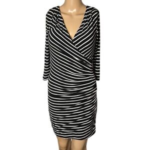 Le Château,faux wrap B&W dress S, NEW! surplice striped,pleats,ruching,stretchy