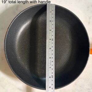 Le Creuset low heat enamelled size 25 cast iron skillet with non stick coating in flame. This 9” diameter frying pan has the classic ombré orange hue and wooden handle. Handle is stamped “teck”. Some residue on the underside as can be seen in pics.