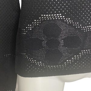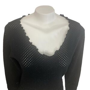Rare Y2K Italian designer piece from Le Donne Di Mariella Aburani. This black open-knit wool sweater features a scalloped lettuce-edge neckline and floral mesh detailing. New with tags and made in Italy — a refined quiet-luxury staple originally retailing for $795 CAD.