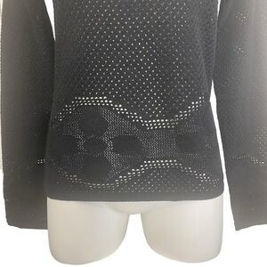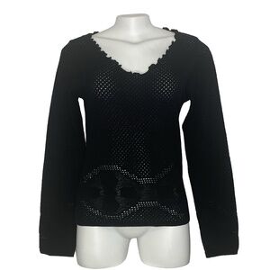 A genuine Y2K-era designer knit from Le Donne Di Mariella Aburani — the prestigious sub-line of the Mariella Burani Fashion Group, known for its Italian craftsmanship and sophisticated femininity. This semi-sheer black mesh sweater blends soft wool comfort with scalloped detailing and modern minimalist design.