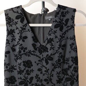 Black with velvet flower accents. V-neck. Fully lined. Hidden back zipper closure. Very beautiful fit.