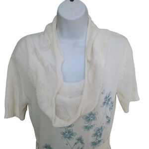Retro style knit sweater dress with floral designs and faux rhinestone beading. Loose cowl neckline. Short sleeves. Belt loops with matching tie at waist.