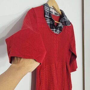 Le Grenier Red Knit Sweater Black White Plaid Collar Underlay 3/4 Sleeve Pullover Size Large