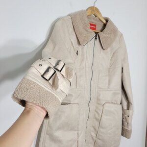 This coat by Le Grenier is in excellent condition. It is an all-over tan color with a faux shearling collar, cuffs, and liner. It is made out of 100% Polyester. It has a zip-up closure, two front pockets, and one zip pocket on the chest. It has two adorable belts and buckle details on each cuff to adjust the tightness.
