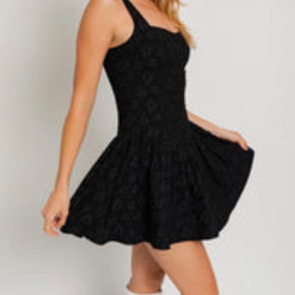 Le Lis black mini dress with a low waist line, sleeveless, with a beautiful flower design.