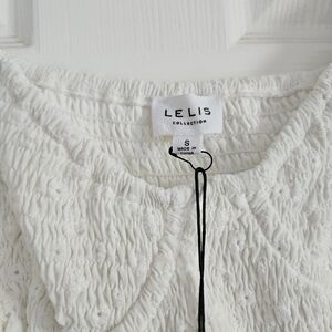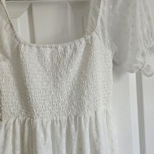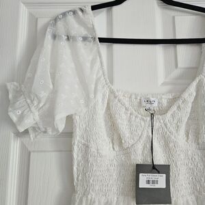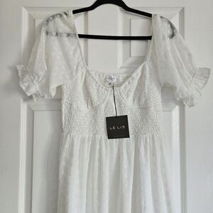This elegant white sundress by Le Lis features a scoop neckline and charming puff sleeves, perfect for a bridal or wedding guest occasion. The midi length and airy fabric create a graceful silhouette, making it an ideal choice for a summer celebration.