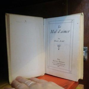 Très beau livre antique : Le Mal D'Aimer par Henri Ardel, Paris, Nelson, Éditeurs, 25, rue Denfert-Rochereau, Londres, Édimbourg et New York, 1927. 378 + 6 pages. Trèsbonne condition vu son age. Le principal signe est le jaunissement. Il y a des roussures, il y a une tache sur la tranche. Couverture rigide, reliure de toile solide et jolie. Rien de détaché, il ne manque aucune page. Trace de marqueur sur une page, voir photos pour plus de détails. Ce roman est tout à fait en bon état que ce soit pour le lire ou le disposer avec votre collection. Maison non fumeur.