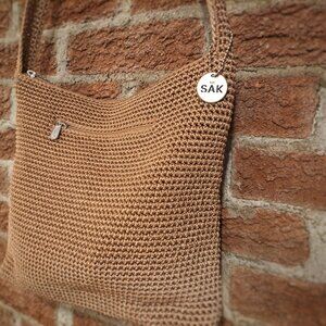 The colour is beige/tan. The bottom is firm and the woven fabric is structured which keeps the bag's shape. There is a zipper pocket on the inside, and one on the outside. All hardware has The Sak logo branded on it.