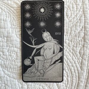 Major Arcana only, perfect condition, only taken out of the box to be looked at. Le Tarot de L’étoile Cachée (The Tarot of the Hidden Star) echoes ancient divination practices encouraging you to follow your inner Star. Hands down the most beautiful tarot deck in existence imo.This is a specific tarot deck created by Italian illustrator Elisa Seitzinger for Sabat Magazine, inspired by the Tarot de Marseille with a unique design featuring silver ink on a matte black background. Limited run in 2020 has long since sold out. Due to the nature of handcrafted cards, they may contain small imperfections.