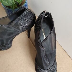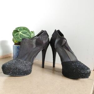 Le chateau | Black rhinestone heels with see through mesh and zipper backs. woman's size 8.