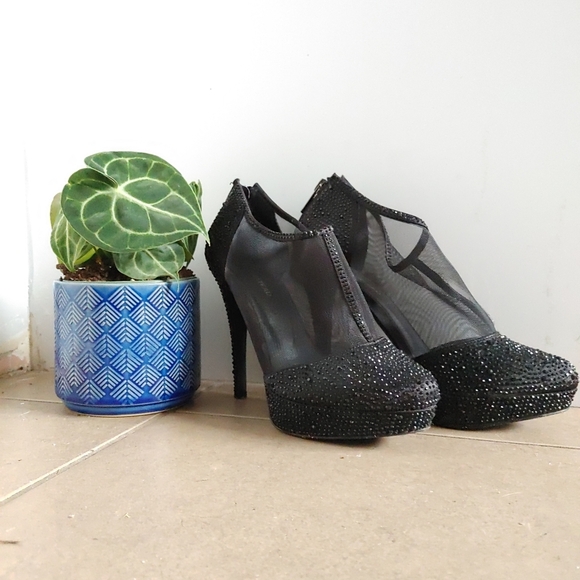 Le chateau | Black rhinestone heels with see through mesh and zipper backs. woman's size 8.