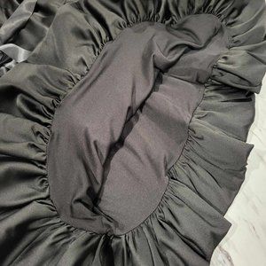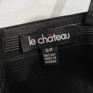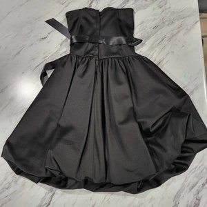 Le chateau black strapless satin pouf dress with ribbon. Really well made, boning in the bodice, Size small. The ribbons are fraying slightly, The ribbon itself isn't attached so it can be easily replaced. I loved this dress for weddings.