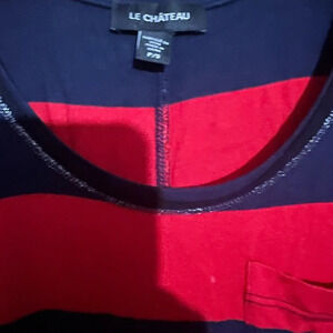 Red, blue with a silver sparkle down the back and on front color. Lightly enjoyed. Light signs of wear may be visible but none detected. No rips nor stains. Cute little summer top.